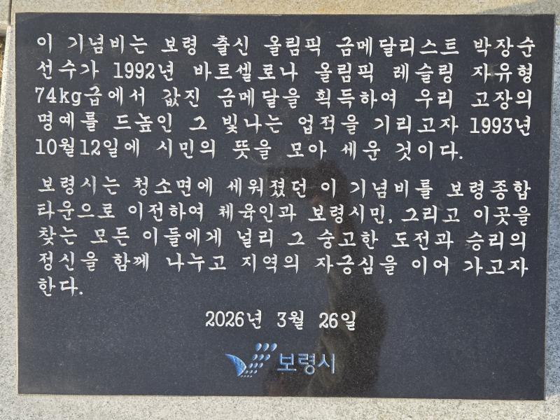 보령시는 26일 박장순 감독의 빛나는 체육 업적을 기리고 시민 자긍심을 높이고자 ‘박장순 기념비 이전 사업’을 성공적으로 마무리하고, 새로운 장소인 보령종합체육관 앞에서 제막식을 개최했다. 박장순 기념비는 1993년 바르셀로나 올림픽 금메달 획득을 기념하기 위해 세워졌으며, 기존의 청소면에서 보다 많은 시민과 체육인들이 쉽게 접할 수 있는 체육관으로 이전했다.