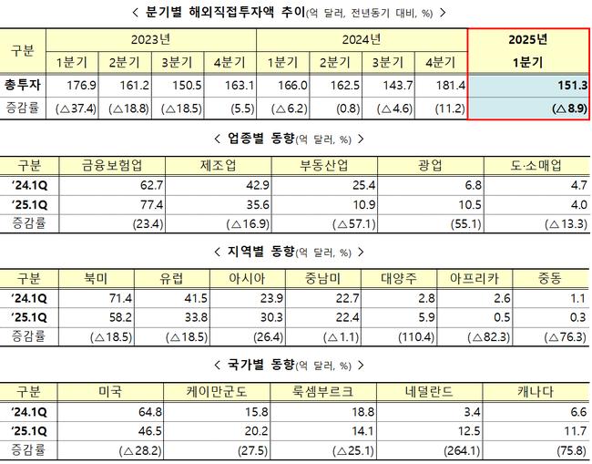 국가별 투자액은 미국(46.5억 달러)이 가장 높았으나, 전년 동기 대비 28.2% 감소하며 총투자 감소를 견인했다. 미국 제조업 투자액은 전 분기와 같은 16.9억 달러로 유지됐지만, 금융보험업 부문 투자 축소가 전체 대미 투자 하락을 이끌었다. 반면, 케이만군도(27.5%)와 네덜란드(264.1%), 캐나다(75.8%)에 대한 투자는 증가세를 나타냈다.