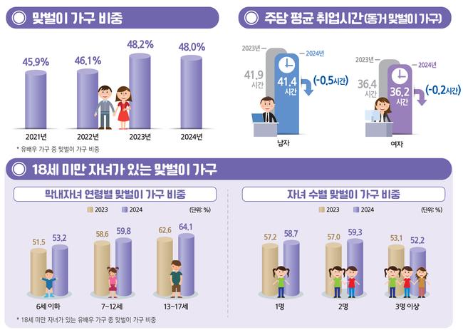 18세 미만 자녀가 있는 유배우 가구(393만 7천 가구) 중 맞벌이 가구는 230만 4천 가구로 전년 대비 2만 2천 가구 감소했지만, 해당 유배우 가구 중 맞벌이 가구 비중은 58.5%로 전년 대비 1.7%포인트 상승했다. 막내 자녀 연령별 맞벌이 가구 비중은 6세 이하(1.7%포인트), 13~17세(1.5%포인트), 7~12세(1.2%포인트) 모두 전년 대비 상승한 것으로 나타났다. 18세 미만 자녀가 있는 맞벌이 가구의 주당 평균 취업 시간은 39.0시간으로 전년 대비 0.1시간 감소했다.