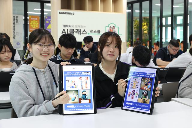 인천 아라고등학교에서 진행된 ‘갤럭시와 함께하는 AI 클래스 @스쿨’에서 학생들이 갤럭시 AI를 활용한 진로 비전보드 만들기 프로그램을 체험하는 모습