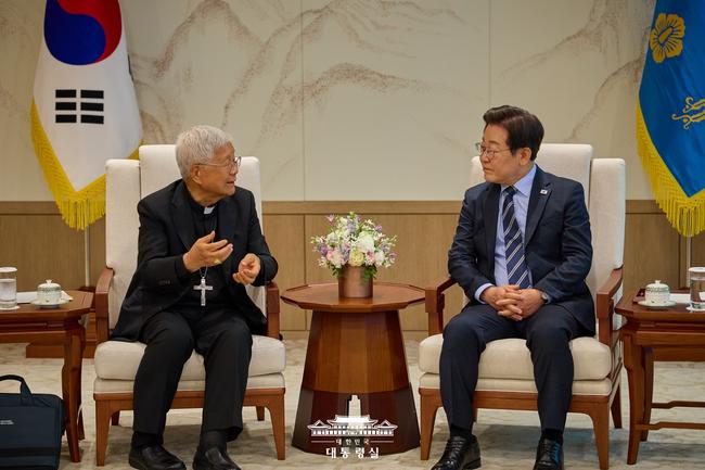 이재명 대통령이 7월 7일 오후 2시 대통령실에서 교황청 성직자부 장관 유흥식 추기경을 접견하고, 한반도 평화와 민주주의 회복에 대한 교황청의 역할과 협력 방안을 논의했다.