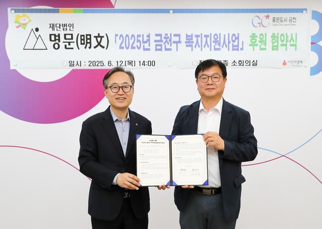 금천구(구청장 유성훈)는 6월 12일 금천구청 소회의실에서 재단법인 명문(明文)과 2025년 금천구 복지지원사업을 위한 협약식을 진행했다고 밝혔다.