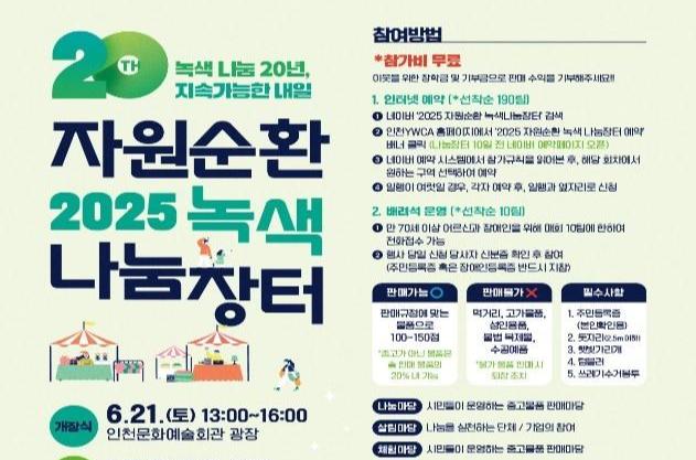 인천광역시(시장 유정복)는 탄소중립 실천과 나눔 문화 확산을 위해 인천시가 주최하고 인천YWCA가 주관하는 '2025 자원순환 녹색 나눔장터'(이하 나눔장터)를 오는 6월 21일 인천종합문화예술회관 광장에서 개최한다고 밝혔다.