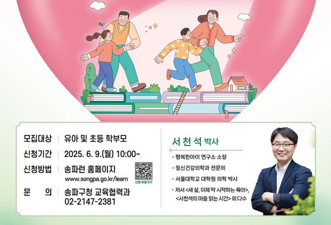 서울 송파구는 오는 6월 25일 오전 10시 구청 대강당에서 소아정신과 전문의 서천석 박사를 초청해 ‘아이 공부 이야기’를 주제로 한 학부모 대상 무료 특강을 연다고 밝혔다.