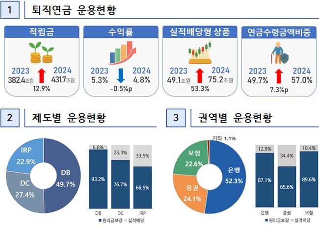 퇴직연금 적립금은 2023년보다 49.3조원 증가(12.9%)한 431.7조원으로, 3년 연속 두 자릿수 성장률을 기록했다. 특히 실적배당형 상품에 투자된 금액은 75.2조원으로 전년 대비 53.3% 급증했으며, 전체 적립금 중 실적배당형 비중도 17.5%로 상승했다(2022년 11.3%, 2023년 12.8%).