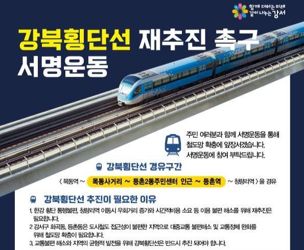 이는 지난 2024년 6월 기획재정부 예비타당성조사에서 탈락한 강북횡단선 사업의 재추진을 위한 강서구민의 강력한 의지를 관련 기관에 전달하기 위함이다.