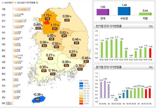 수도권은 1.40%, 지방은 0.44% 상승하며 전반적인 둔화세를 보였다. 시도별로는 서울(1.73%)과 경기(1.17%)가 전국 평균을 웃돌았고, 시군구 단위에서는 강남구(2.81%), 용산구(2.61%), 용인 처인구(2.37%) 등이 상위권에 올랐다. 상반기 동안 전국 252개 시군구 가운데 47곳이 전국 평균을 상회했다.