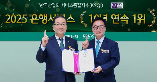 하나은행(은행장 이호성)은 한국능률협회컨설팅(대표이사 한수회, KMAC)이 주관하는 2025년 한국산업의 서비스품질지수(KSQI: Korean Service Quality Index) '고객 접점' 부문에서 10년 연속 1위 은행에 선정됐다고 밝혔다.
