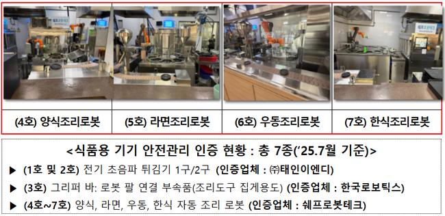 식품의약품안전처는 7월 10일, 자동으로 돈까스·라면 등을 조리하는 조리로봇 4종에 대해 ‘식품용 기기 안전관리 인증’을 완료했다고 밝혔다.