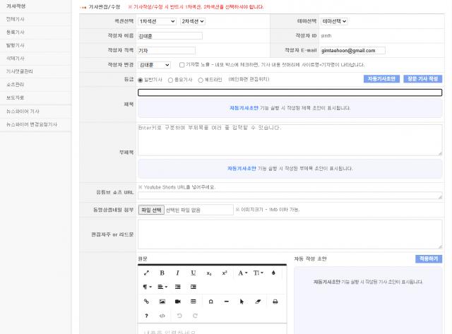 ‘AI수습기자’ CMS 적용 화면. 기사 작성 및 송고 시스템 내에서 AI수습기자를 활용해 기사 초안을 만들고 송고할 수 있다