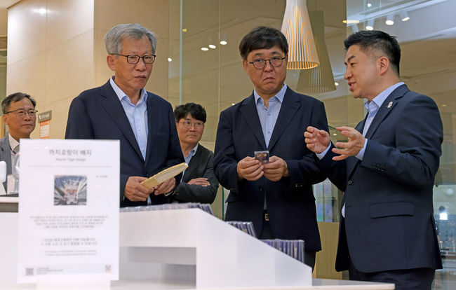 최휘영 문화체육관광부 장관이 3일 서울 용산구 국립중앙박물관을 찾아 유홍준 국립중앙박물관장과 함께 박물관 상품[뮷즈(MU:DS)] 판매 상황을 점검하고 있다.