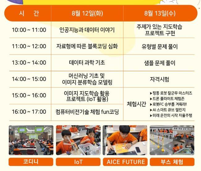 KT와 연계하여 진행되는 이 프로그램은 인공지능 이론 및 실습 교육과 함께 '모두를 위한 인공지능 자격(AICE, AI Certificate for Everyone)' 시험 기회를 제공한다. 특히 교육 후에는 자율주행 자동차, 로봇 축구, 드론 조종 등 다양한 체험 활동을 통해 학생들의 인공지능에 대한 흥미를 높일 수 있도록 설계되었다.