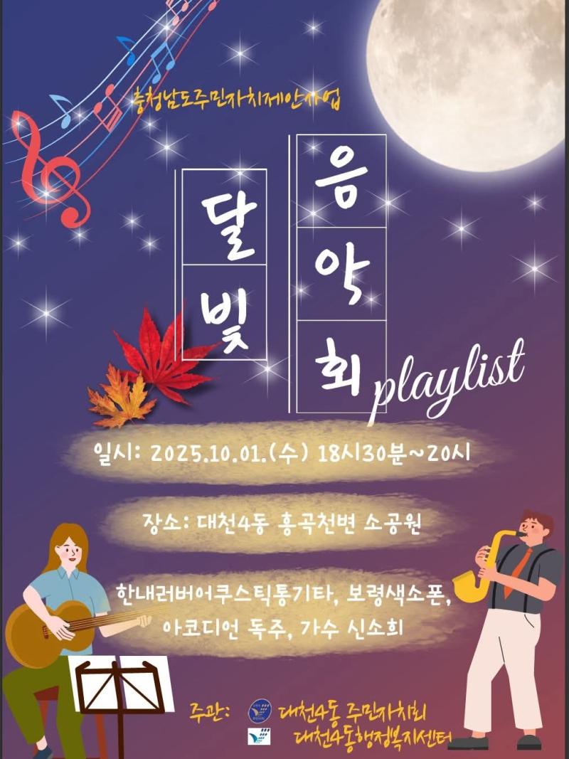 ‘달빛 음악회’는 대전4동 주민자치회와 대전4동 행정복지센터가 함께 꾸린 주민 참여 기획으로 지역 동아리와 생활 음악인이 한 무대에 서고, 주민이 관객이자 연출자가 되는 구조가 특징이다. 주최 측은 “공연을 일회성 행사로 끝내지 않고, 주민과 함께 이어지는 행사로 확장하겠다”는 뜻을 밝혔다.