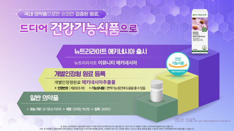 한국암웨이는 면역 기능 증진에 도움을 주는 원료인 에키네시아추출물을 함유한 건강기능식품 ‘뉴트리라이트 이뮤니티 에키네시아’를 지난 13일 출시했다고 밝혔다.