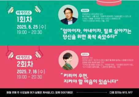 1회차 행사(6월 25일)에서는 ‘우리가 인생이라 부르는 것들’의 저자 정재찬 교수가 ‘엄마이자, 아내이자, 딸로 살아가는 당신을 위한 폭싹 속았수다’라는 제목으로 강연을 진행할 예정이다. 이번 강연에서는 일상 속 여성들이 겪는 역할 갈등과 가족 돌봄이라는 부담에 공감하고, 문학을 전공한 교수로서 시와 문학작품을 소개해 정서적 치유의 시간을 제공한다.