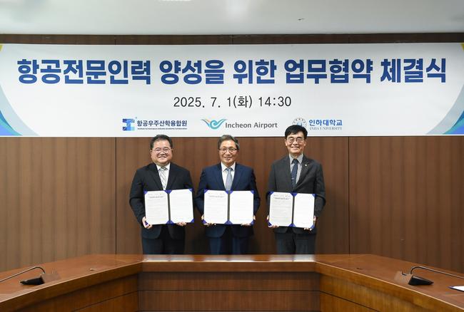 인천국제공항공사(사장 이학재)는 지난 1일 공사 회의실에서 인하대학교(총장 조명우), 항공우주산학융합원(원장 유창경)과 '항공전문인력 양성을 위한 양해각서(MOU)'를 체결했다.