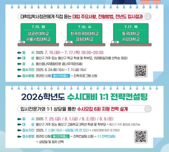 이와 함께 '2026학년도 수시대비 1:1 전략컨설팅'이 총 4차례 예정돼 있다. 7월 25일과 8월 1일에는 용산구청 2층 진학 상담실에서, 8월 2일과 9일에는 용산꿈나무종합타운 원어민외국어교실에서 진행되며, 용산구에 거주하거나 지역 내 고등학교에 다니는 3학년 학생과 학부모가 대상이다. 구에 거주하는 졸업생도 신청 가능하며, 모집 인원은 총 126명이다.
